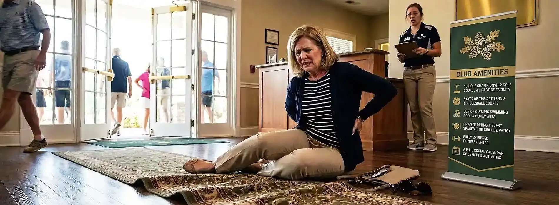 - Wet or slick floors in clubhouses, locker rooms, bathrooms, spas, and dining areas.