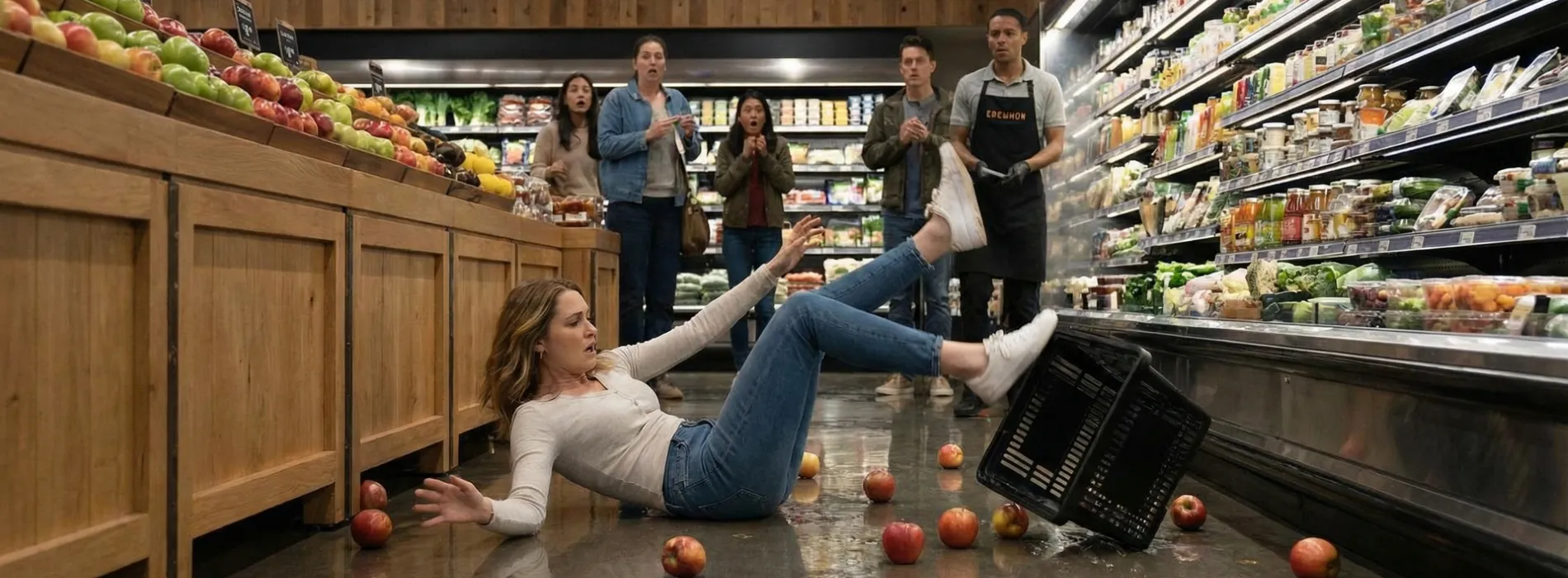 Woman falling in Erewhon Market aisle after slipping on a box, with employees and customers nearby