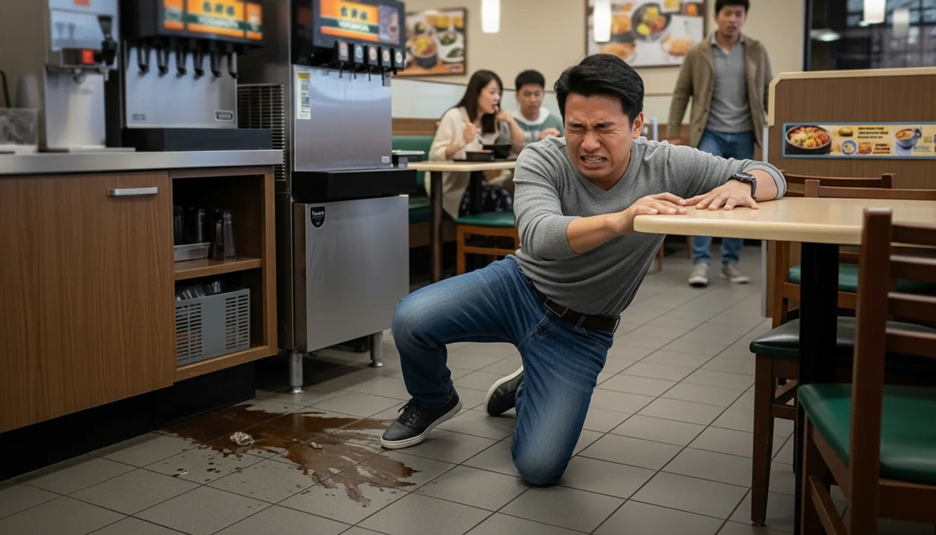 - Slip-and-Fall Injuries — Slip-and-fall injuries happen when you slip on a spill, wet floor, grease, or uneven surface in the dining area or restroom. These incidents can cause: